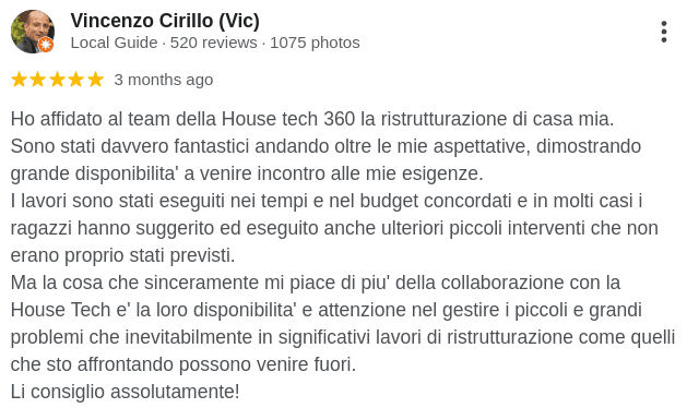 Dai bagni alle ristrutturazioni complete, i nostri clienti raccontano come House Tech li ha aiutati a trasformare le loro idee in spazi funzionali e splendidamente rifiniti che amano davvero.